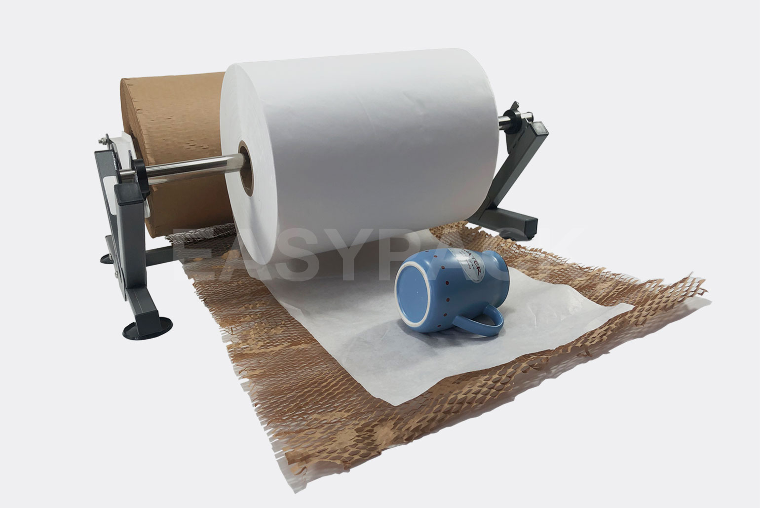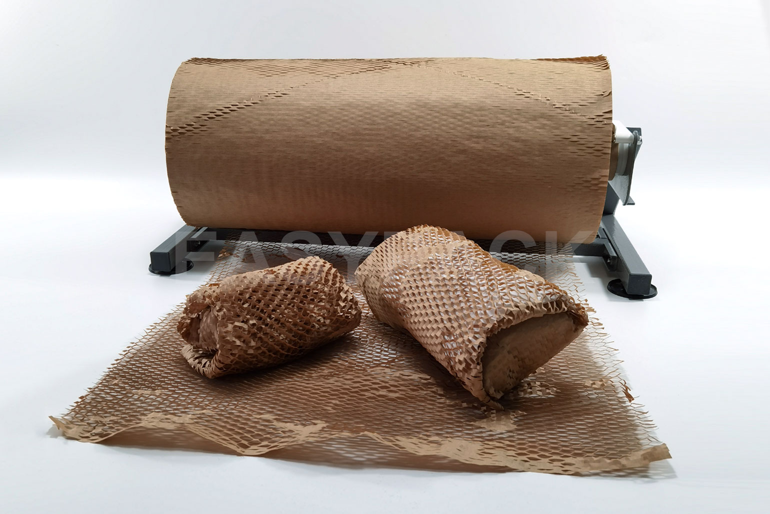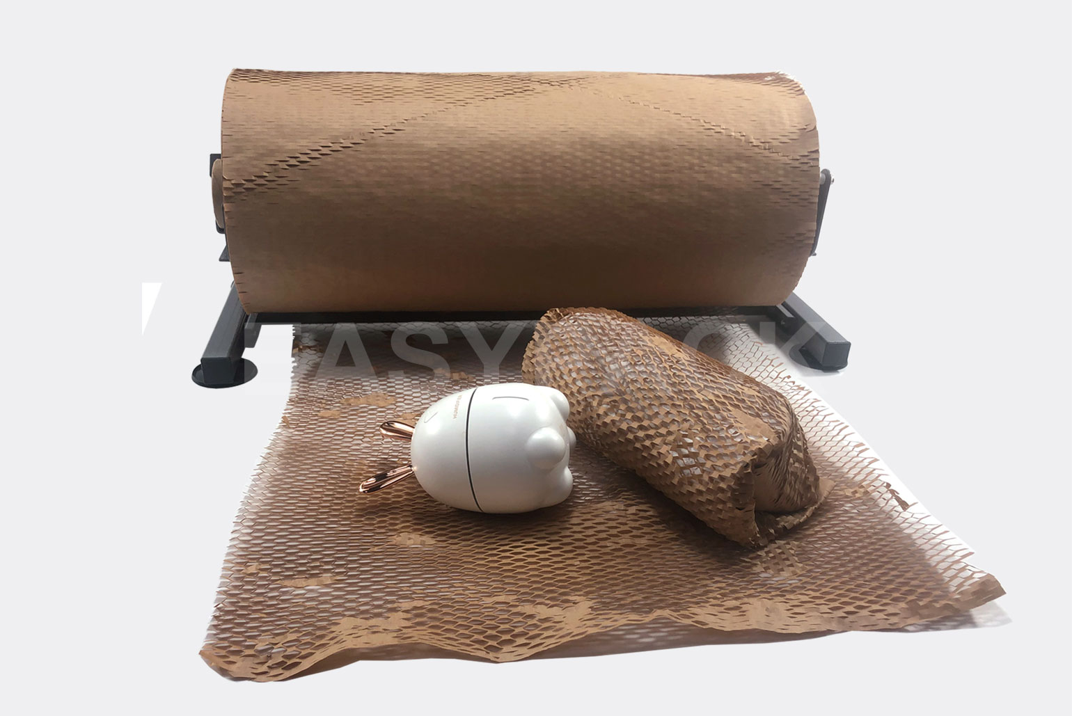 3D六角蜂窩狀的牛皮紙卷,經過拉伸后呈現(xiàn)立體蜂窩結構的紙襯墊,在包裹物品后能產生良好的緩沖防震效果。